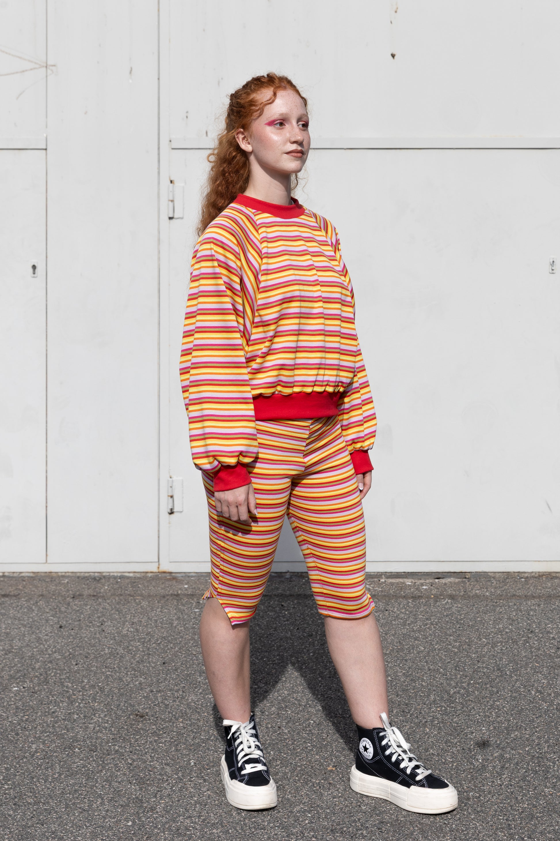 Pantalón tipo mallas capri de punto con cintura cómoda que se adapta al cuerpo, bajo hasta media pierna y diseño de rayas moderno. Disponible en tres tejidos.